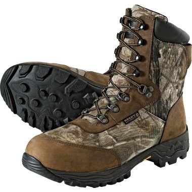 These versatile hunting boots feature lighweight, nonbulky 400-gram Thinsulate Insulation for warmth and Rocky waterproof protection to keep feet dry. High-denier Cordura nylon and nubuck uppers offers long-lasting durability and flexible comfort. Lace-to-toe design offers a better fit and more support. Vibram Prohunter cleat-style outsoles offer biting traction for rough terrain. Shock-absorbing, camo-wrapped EVA midsoles. Removable cushioned polyurethane footbeds. Padded collars. Imported.Mens sizes: 8-13 medium width. Half sizes to 12. Camo pattern: Realtree AP.