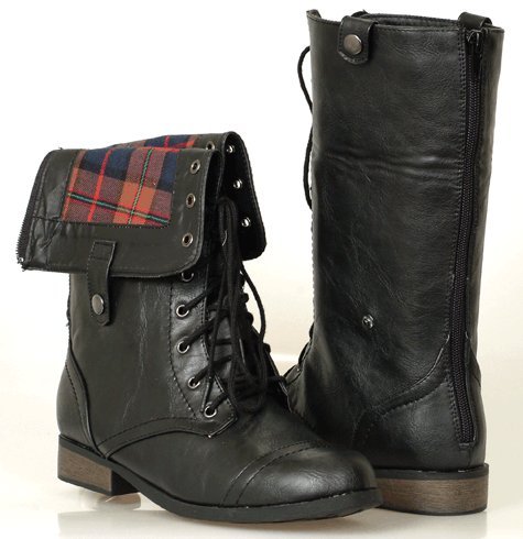 These tough combat inspired lace up boots boost up your courage when you face to face with your biggest fashion enemy! Stylish rustic distressed style. Fashioned with folded cuff. Fabric lining. Back zipper for easy on/off. Coverts from ankle-high to Mid-Calf with snap-on closure.. Round toe, low heel, smooth lining and padded insole.