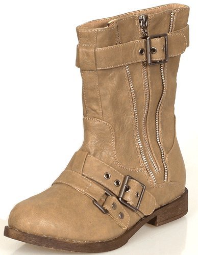 These tough combat inspired lace up boots boost up your courage when you are face to face with your biggest fashion enemy! Stylish rustic distressed style. Fashioned with metallic zipper embellishment and double decorative buckle straps in the back shaft. Round toe, low heel, smooth lining and padded insole. Pull on style. Zipper is only for decoration.